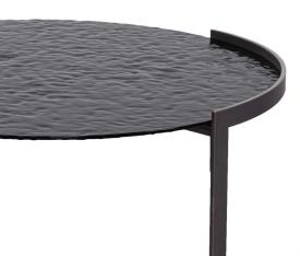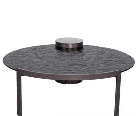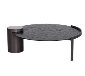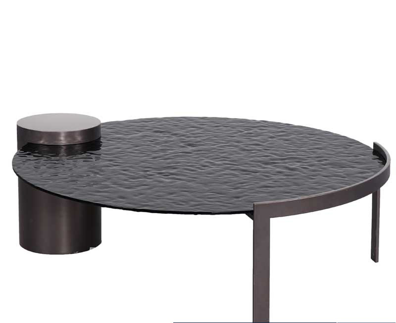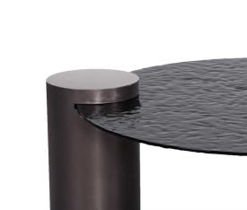 Colonne et base en métal laqué époxy bronze, plateau sur verre noir métallisé martelé trempé 8mm