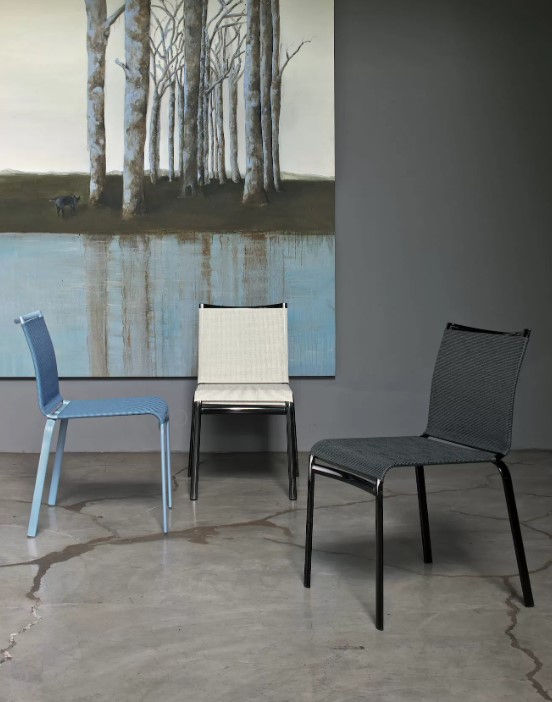 Design. Molteni - Réf. 04.56 Dimensions : l 48 x h 81 x p 59 cm chaise sans ou avec accoudoirs pour l'intérieur ou l'extérieur, structure en Métal lacqué ou chromé. Assise et dossier en Texplast ou Soft Texplast.