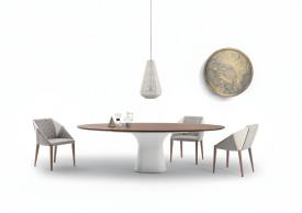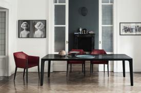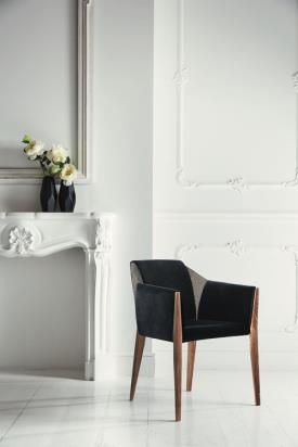 Bontempi Design. Toshiyuki Yoshino - Réf. 34.06 / 34.07 Dimensions : l 60/62 x h 81 x p 60/61 cm chaise et chaise avec accoudoirs et structure en Bois massif, coque rembourrée et revêtue en Cuir Éco, Cuir Éco Premium, tessuto Nordic, Pure Virgin Wool, Velours et Peau Premium.