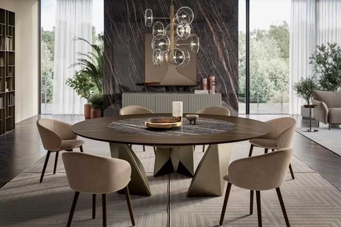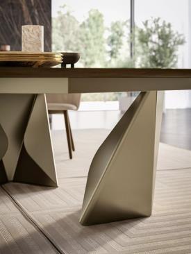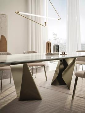 Bontempi Design. Andrea Lucatello - Réf. 54.40 / 54.41 / 54.42 / 54.43 / 54.44 / 54.69 / 54.47 / 54.48 / 54.49 / 54.30 / 54.32 / 54.34 / 54.36 / 54.74 / 54.45 / 54.46 / 54.68 / 54.37 / 54.38 Dimensions : l 150/.../400 x h 75 x p 90/.../130 cm La table Kaleido attire le regard, non seulement par ses dimensions imposantes, mais aussi par son design visionnaire. Son pied sculptural, caractérisé par une section triangulaire audacieuse, évoque les symétries fascinantes d’un kaléidoscope – un jeu de formes qui se transforment et évoluent sous chaque angle. Ce design atteint une parfaite harmonie entre architecture et art, où la robustesse du métal se fond élégamment avec la précision des lignes sculptées. Kaleido offre une personnalisation étendue, du choix de deux ou trois bases à la forme et aux dimensions du plateau, permettant des solutions sur mesure adaptées à divers besoins esthétiques et fonctionnels. Véritable chef-d'œuvre pour ceux qui apprécient la beauté dans l’harmonie des proportions et le contraste entre force et délicatesse, Kaleido incarne la fusion du design, de l’émotion et de la grandeur.