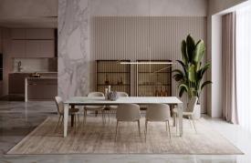 Bontempi Réf. 7T001 / 7T002 Dimensions : 200 x 300 cm Maverick est un tapis sophistiqué en viscose et coton, deux matières qui se fondent dans une surface douce et chatoyante. Le mélange des fils crée une texture à la luminosité naturelle, changeant d’aspect selon le point de vue et l’incidence de la lumière. Sa surface réagit comme un fin velours : les ombres se déplacent avec légèreté, suivant le geste et la lumière, dessinant des nuances et des profondeurs qui donnent vie à un paysage tactile et visuel. Un tapis qui décore avec discrétion mais laisse une empreinte forte grâce à sa matérialité et au jeu sophistiqué des reflets.