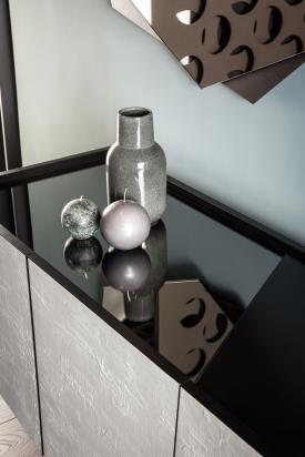 Le plateau est constitué d'un verre façonné sérigraphié noir, serti sur le bois. Le côté extérieur des quatre portes, telle une œuvre d'art, est agrémenté d'une décoration sophistiquée, tandis que leur périmètre géométriquement irrégulier est souligné par un bord peint. Les intérieurs et les étagères assortis sont en verre à bords polis. La ligne des portes est interrompue par un compartiment ouvert. La décoration et la finition des portes peuvent être choisies parmi de nombreuses alternatives Cantori.
