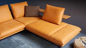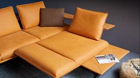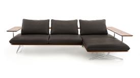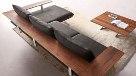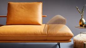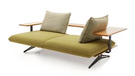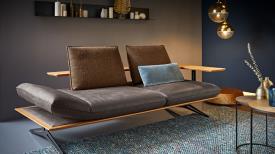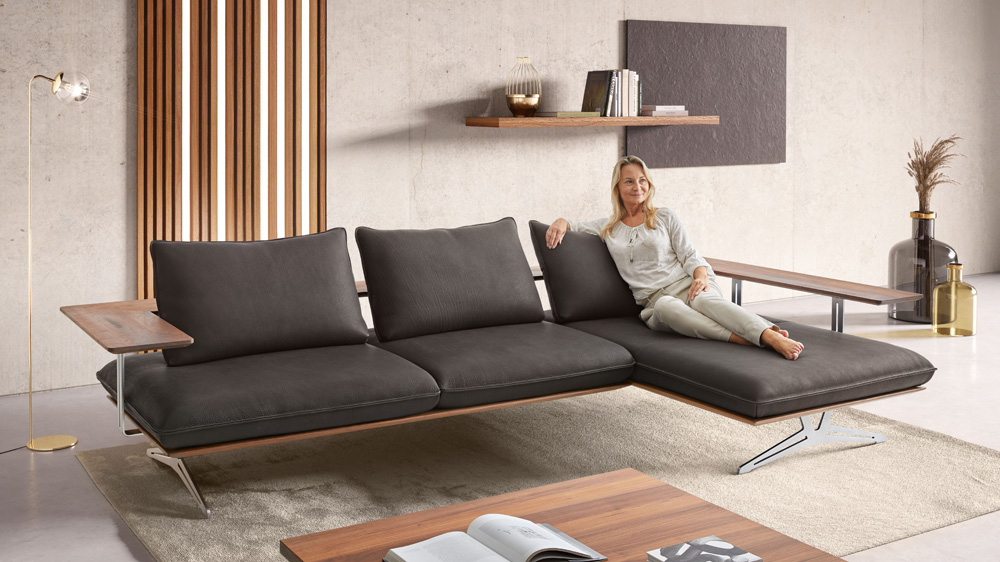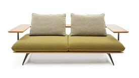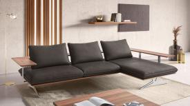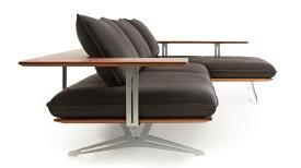 - Des glissières métalliques élégamment incurvées confèrent au canapé une légèreté aérienne, disponibles en nickel satiné (aspect acier inoxydable) ou en noir mat texturé thermolaqué.