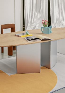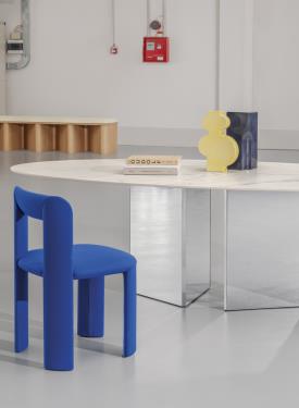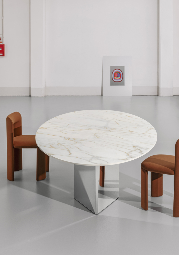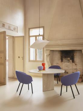 Table harmonieuse, Albio est empreinte d’un charme impérial : sa première version a en effet été réalisée en travertin, le marbre privilégié par les Romains pour la construction de leurs plus célèbres monuments. Se distinguant par le biseautage irrégulier de chacun de ses côtés, le plateau repose sur une base rigoureuse facettée en triangle. La douceur de son plateau organique alterne avec la rigidité des dalles qui composent sa base, harmonieusement réunies pour ne former qu’un seul et même corps sculptural. La version table à manger – une variante en miniature pouvant devenir modulaire si besoin est – se déclinent chacune en finition 100 % travertin, bois ou laquée.