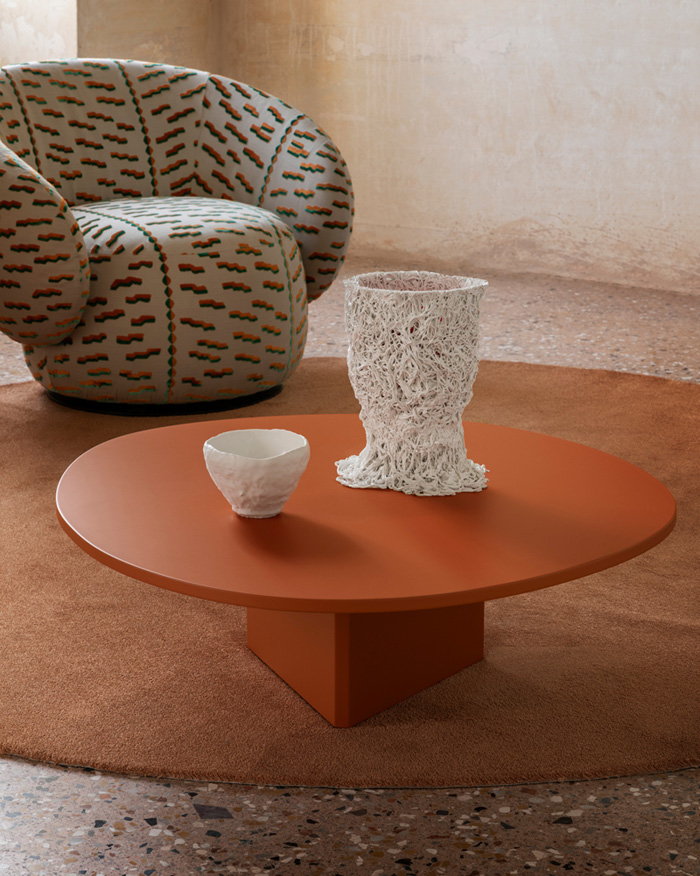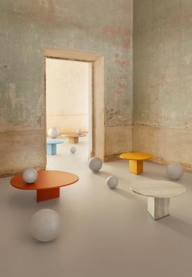 Table harmonieuse, Albio est empreinte d’un charme impérial : sa première version a en effet été réalisée en travertin, le marbre privilégié par les Romains pour la construction de leurs plus célèbres monuments. Se distinguant par le biseautage irrégulier de chacun de ses côtés, le plateau repose sur une base rigoureuse facettée en triangle. La douceur de son plateau organique alterne avec la rigidité des dalles qui composent sa base, harmonieusement réunies pour ne former qu’un seul et même corps sculptural.