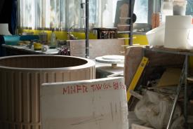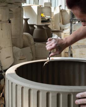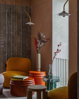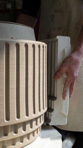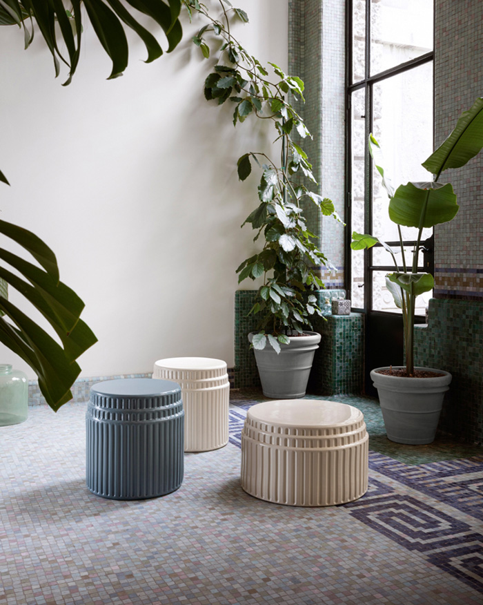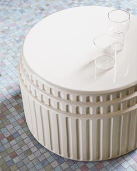 Kolos naît d’un moule en plâtre, dans un atelier de céramiques, où les artisans appliquent l’émail puis l’enfournent. Même si elle est brillante et lisse au toucher, la matière se fait sentir. Les arêtes absorbent moins de couleur et sont plus claires tandis que les pigments se concentrent dans les zones arrondies en les fonçant. Kolos devient ainsi une table basse à forte valeur décorative, en ajoutant à sa fonction de complément une signification artistique, comme s’il s’agissait d’une pièce à exposer. Elle a une esthétique excentrique et interprète avec ironie l’architecture du Colisée.