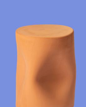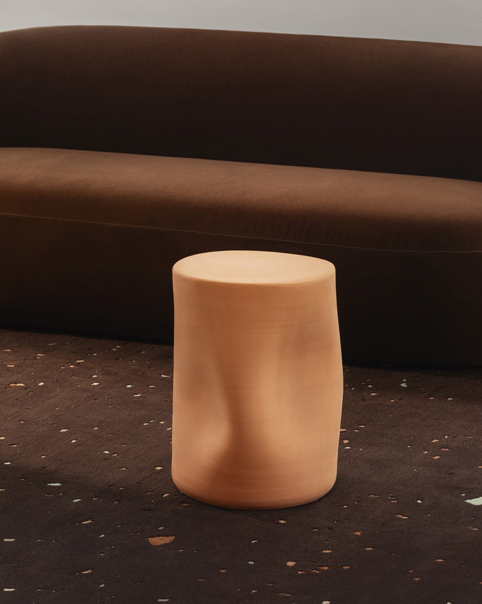 La forme de Toblo, un cylindre en terre cuite qui se transforme en table basse parfaitement lisse à l’exception des côtés ostensiblement adoucis, fait ressortir l’extraordinaire texture de la matière qui le compose. Toblo cristallise le moment précédant la cuisson, lorsque la matière a déjà atteint sa forme définitive entre les mains de l’artisan mais qu’elle est encore fraîche et malléable. Cette astuce permet de préserver et de garantir dans le temps un toucher particulièrement doux.
